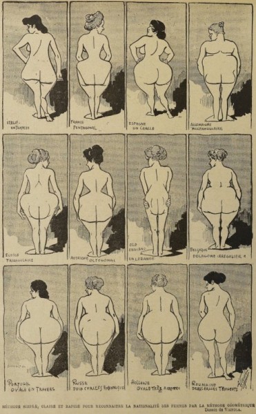 Это рисунок, сделанный художником Le Rire в 1901 году. Он изображает типичные женские попы разных стран Европы. Среди них есть и русская! (Не представляем, как иллюстратор собирал информацию для рисунка. Видимо, полагался на старые добрые стереотипы.)