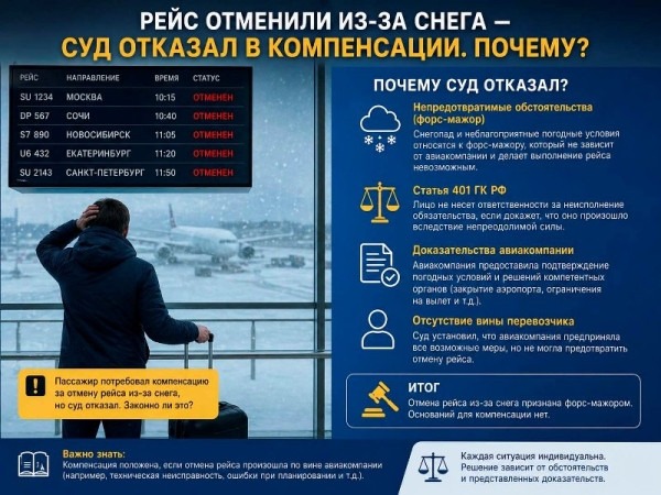 Рейс отменили из-за снега — суд отказал в компенсации. Почему?